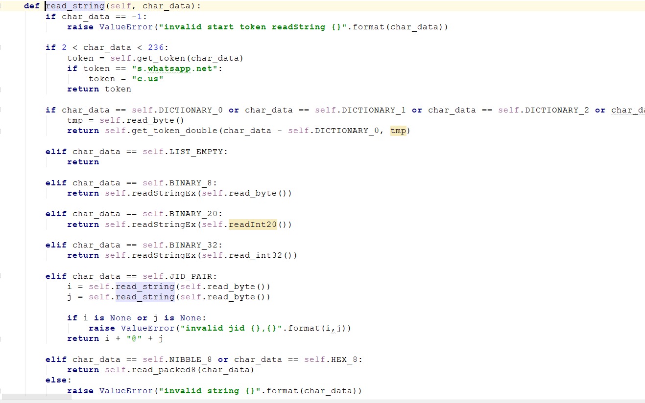 Este es el primer elemento que WhatsApp envía en la comunicación, luego traducimos todas las funciones en la función readString y continuamos con la depuración: